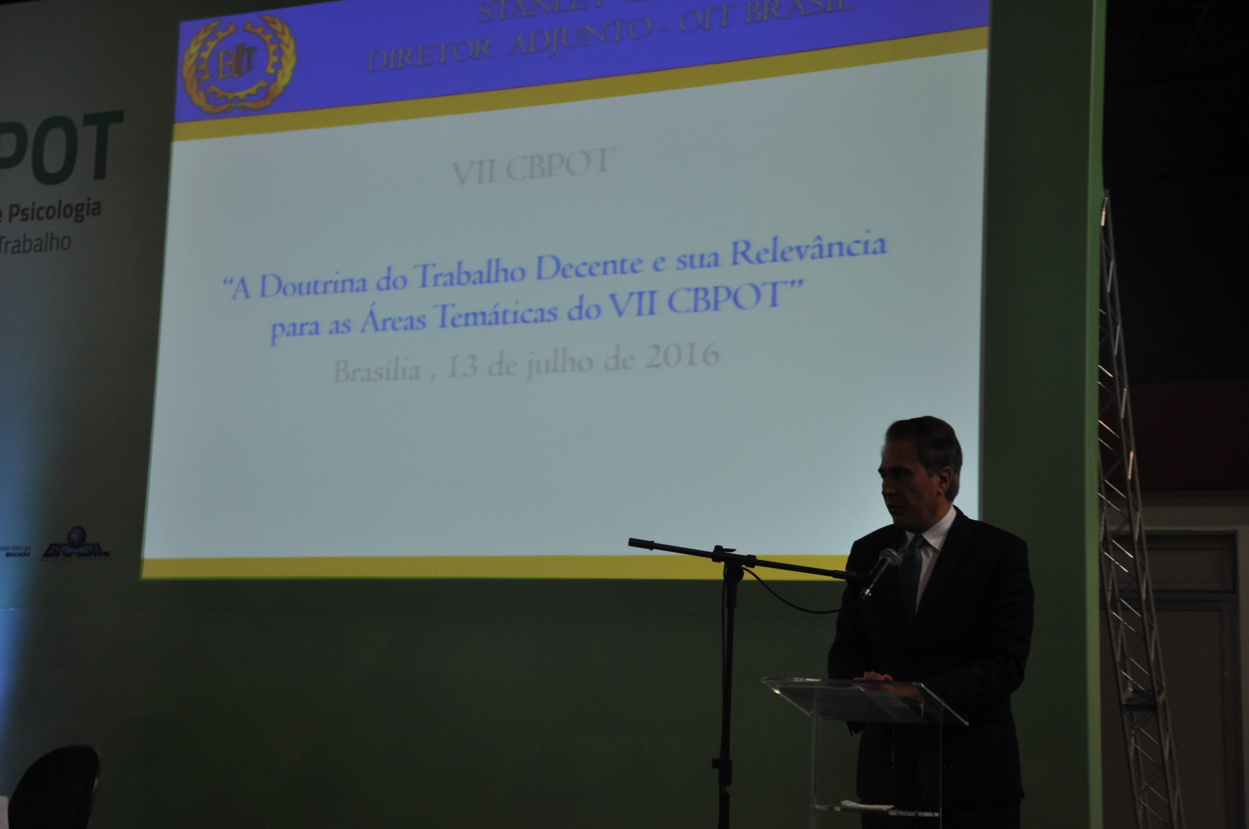 O diretor adjunto da OIT no Brasil, Stanley Gacek, apresentou a palestra “A Doutrina do Trabalho Decente e sua Relevância para as áreas temáticas do VII CBPOT”. Após fazer uma explanação sobre o início da Organização Internacional e do Trabalho, destacou o contexto da agenda do trabalho decente no Brasil que ocorreu de 2003 a 2014, citando dados como a saída de 30 milhões de pessoas da pobreza. O norte-americano elencou também os desafios das relações de trabalho no país após a crise, como o processo de terceirização.