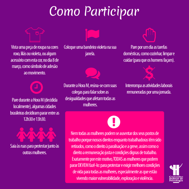 Pela defesa dos direitos das mulheres e em repúdio a todos os tipos de violência contra elas, o Conselho Federal de Psicologia (CFP) convida todas as psicólogas a se engajarem, nesta quarta-feira, na Greve Internacional de Mulheres.