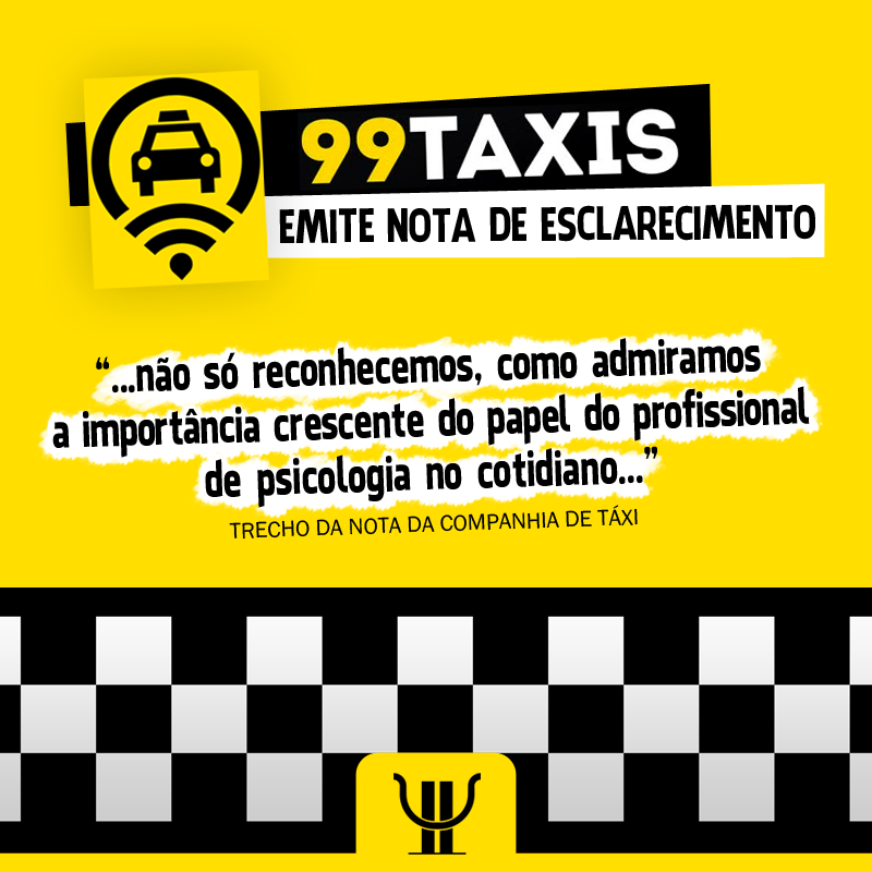 A empresa 99Taxis enviou à Ouvidoria do Conselho Federal de Psicologia (CFP) uma nota de esclarecimentos com pedido de desculpas a respeito de um material publicitário distribuído em alguns carros da frota. A publicidade contava com a frase “O psicólogo está caro? Converse com o taxista”, que gerou indignação dos profissionais da Psicologia e o envio de um ofício por parte do CFP à companhia.