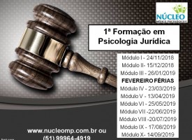 1. Psicologia Jurídica: Fundamentos 2. Psicologia & Direito 3. Psicopatologia Forense 4. Avaliação Psicológica Pericial 5. Psicologia das Varas de Família e Sucessões 6. Psicologia e Justiça do Trabalho 7. Psicologia e Vara da Infância e Juventude 8. Dependência Química no contexto Judiciário 9. Elaboração de documentos Periciais 10. Intervenção em Psicologia Jurídica 11. Instrumentos psicológicos no contexto jurídico