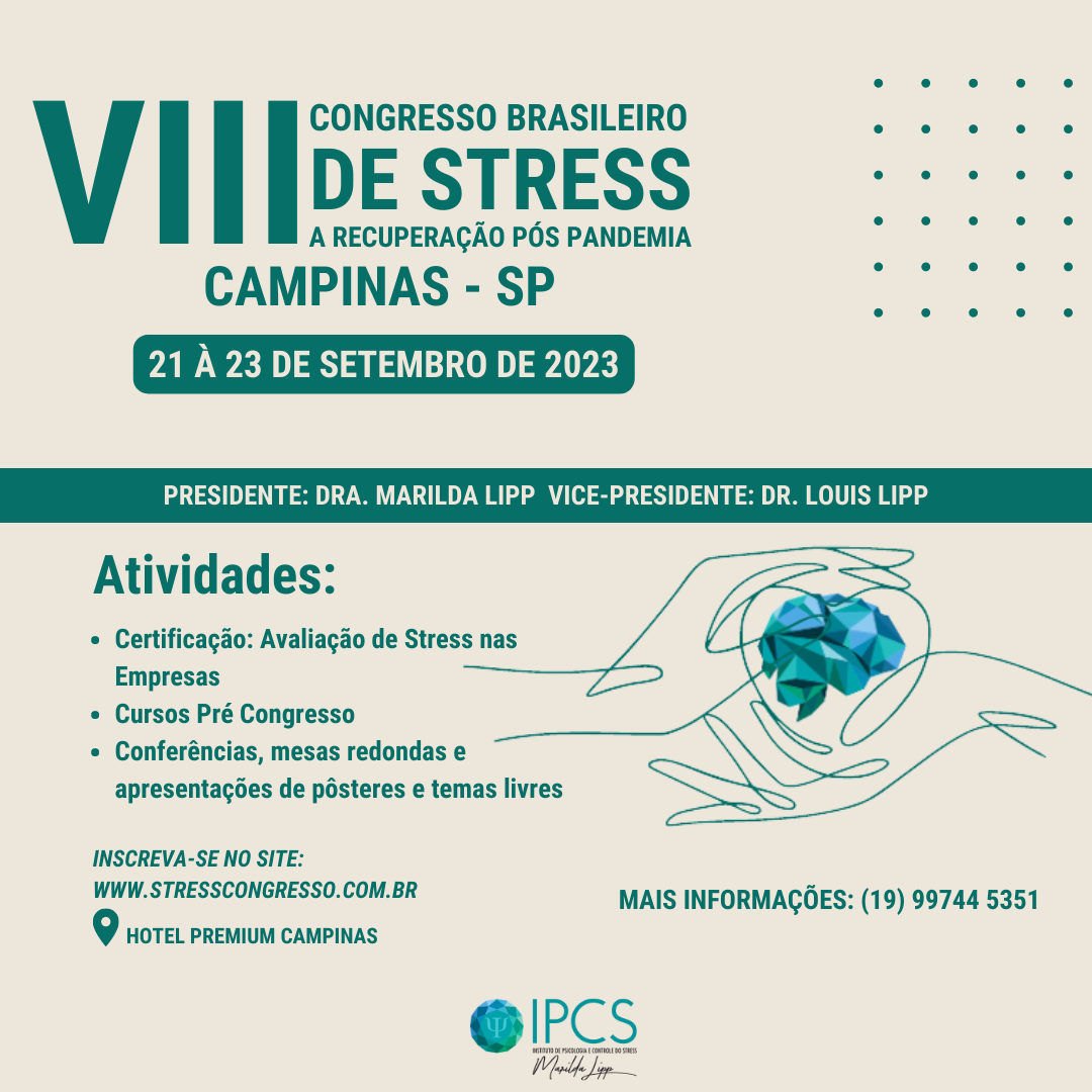O VIII Congresso de STRESS: A RECUPERAÇÃO POS PANDEMIA propõe-se a: Reunir pesquisadores e estudantes para a apresentação e discussão de dados originais de pesquisas brasileiras na área do stress; Reunir especialistas para compartilharem sua atuação clínica com pessoas e empresas que desejam reduzir o stress de seus colaboradores; Discutir métodos de tratamento; Reduzir a lacuna entre os dados de pesquisa e a aplicação prática desses conhecimentos; Possibilitar que empresas apresentem trabalhos sobre ações anti-stress que estejam implementando; Possibilitar o encontro de profissionais interessados nos temas stress e qualidade de vida; Incentivar estudantes a serem novos pesquisadores na área de stress e qualidade de vida. Eixos norteadores: Stress e seu impacto na qualidade de vida. Estilo de vida e sua influência no stress e na qualidade do trabalhador; Avaliação e diagnóstico do stress de adultos e crianças; Stress e suas implicações para a saúde física e mental do ser humano; O stress ocupacional: fatores de risco, e o Burnout; O stress nas escolas e suas implicações para a sociedade; O stress nas relações interpessoais; Resiliência: influência genética e ambiental A herança da pandemia: stress e transtornos mentais