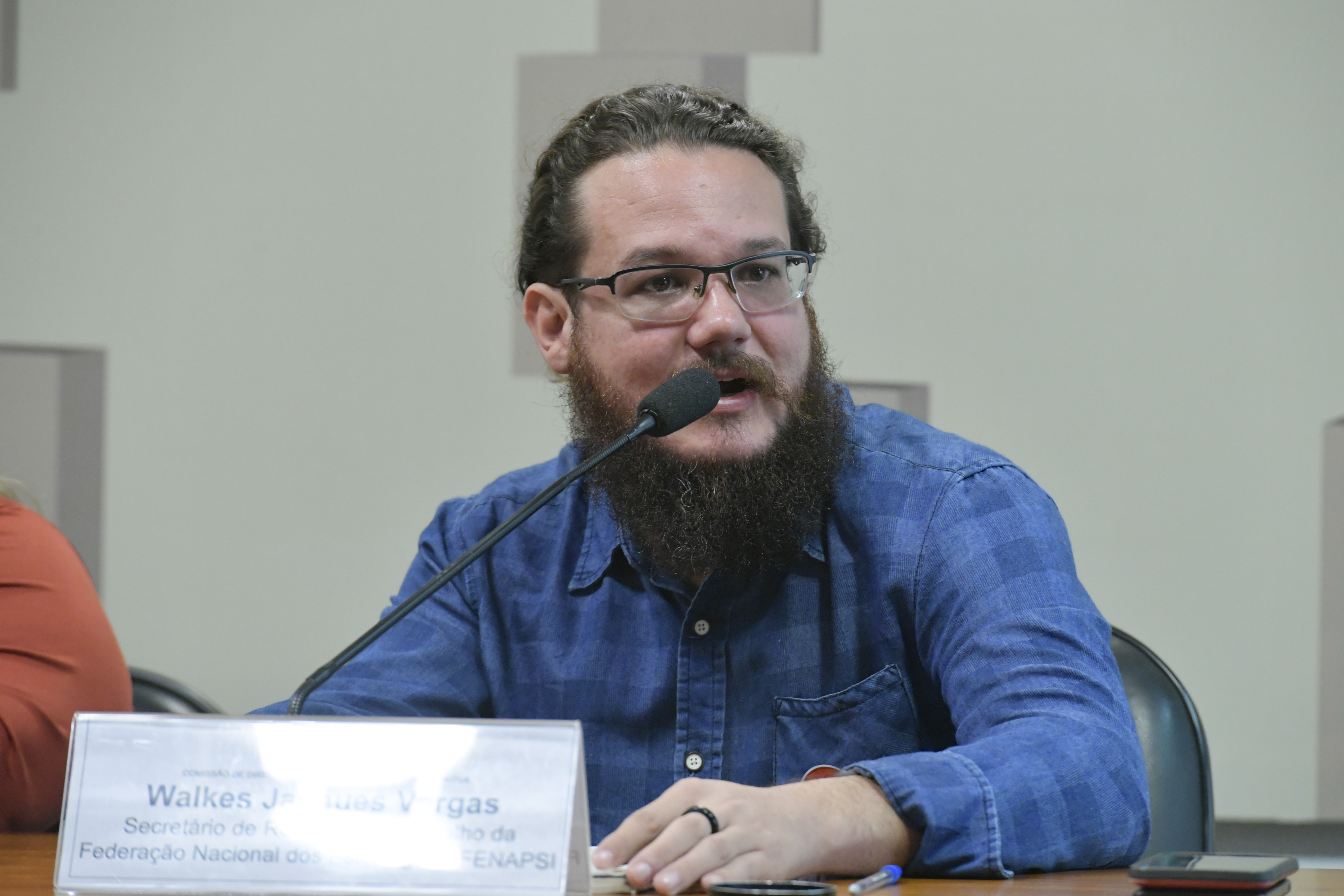 - Comissão de Direitos Humanos e Legislação Participativa (CDH) realiza audiência pública para discutir jornada de trabalho de psicólogos. Em pronunciamento, à mesa, secretário de Relações de Trabalho da Federação Nacional dos Psicólogos (Fenapsi), Walkes Jacques Vargas. Foto: Geraldo Magela/Agência Senado
