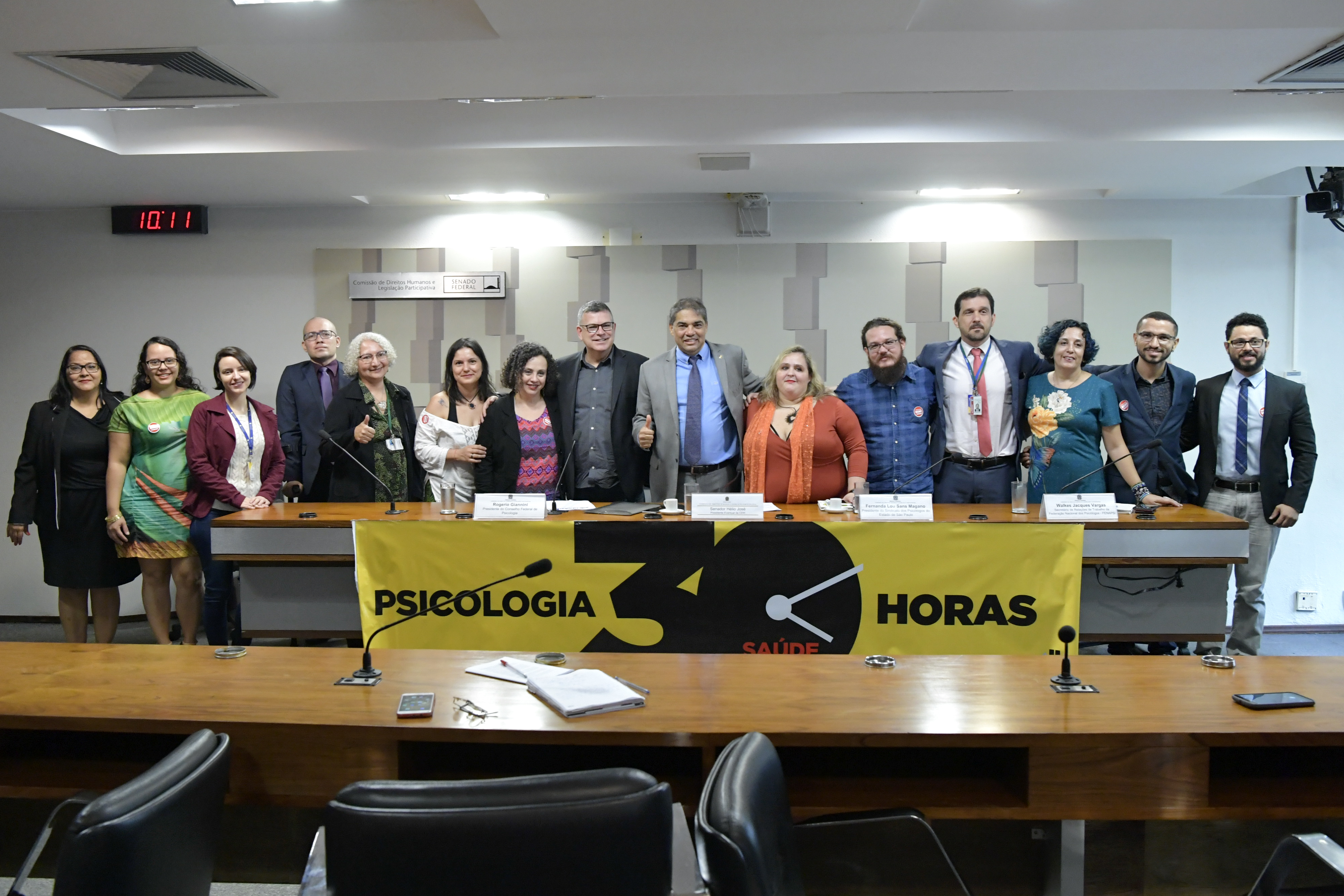- Comissão de Direitos Humanos e Legislação Participativa (CDH) realiza audiência pública para discutir jornada de trabalho de psicólogos. Participantes da audiência pública posam para fotografia. Participam: presidente do Conselho Federal de Psicologia, Rogerio Giannini; presidente eventual da CDH, senador Hélio José (Pros-DF); presidente do Sindicato dos Psicólogos do Estado de São Paulo, Fernanda Lou Sans Magano; secretário de Relações de Trabalho da Federação Nacional dos Psicólogos (Fenapsi), Walkes Jacques Vargas. Foto: Geraldo Magela/Agência Senado