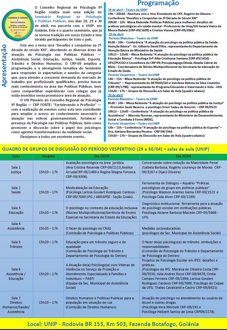 Local: Sede do Conselho Federal de Psicologia – SAF SUL (Setor de Administração Federal Sul), Quadra 2, Bloco B, Edifício Via Office, Térreo, Sala 104, Brasília (DF)