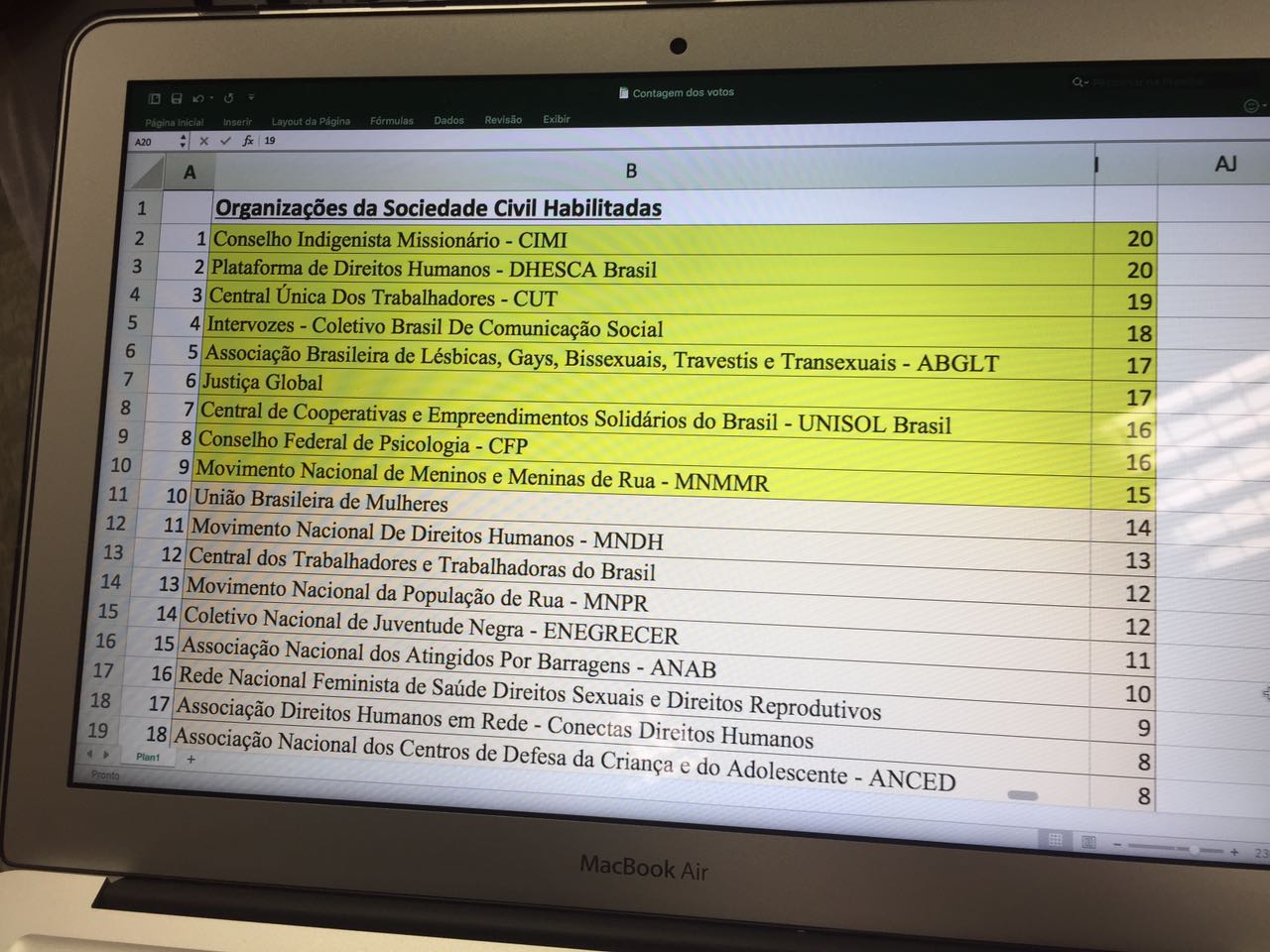 As outras organizações com assento como titulares serão: Conselho Indigenista Missionário (Cimi), Plataforma de Direitos Humanos – Dhesca Brasil; Central Única dos Trabalhadores (CUT), Intervozes – Coletivo Brasil de Comunicação Social, Associação Brasileira de Lésbicas, Gays, Bissexuais, Travestis e Transexuais (ABGLT), Justiça Global, Central de Cooperativas e Empreendimentos Solidários do Brasil (Unisol Brasil) e Movimento Nacional de Meninos e Meninas de Rua (MNMMR).