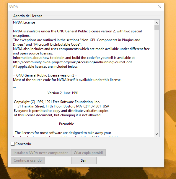 No momento seguinte, em outra tela, surgirá o Termo de Licença do software. Marque a caixa de seleção “Concordo” e, em seguida, clique no botão “instalar o NVDA neste computador”.