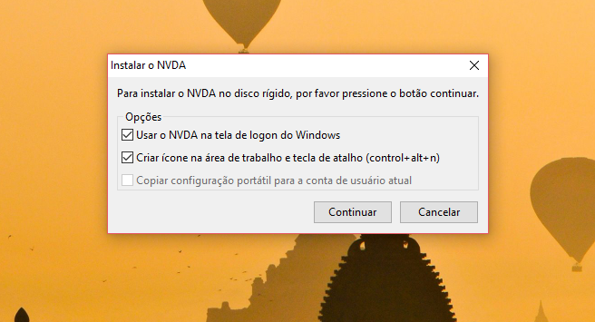 Ao aparecer a próxima tela, desmarque a primeira opção “Usar o NVDA na tela de Logon do Windows” e marque a segunda opção “Criar ícone na área de trabalho”. Em seguida, clique em “Continuar” e aguarde o fim da instalação do programa.