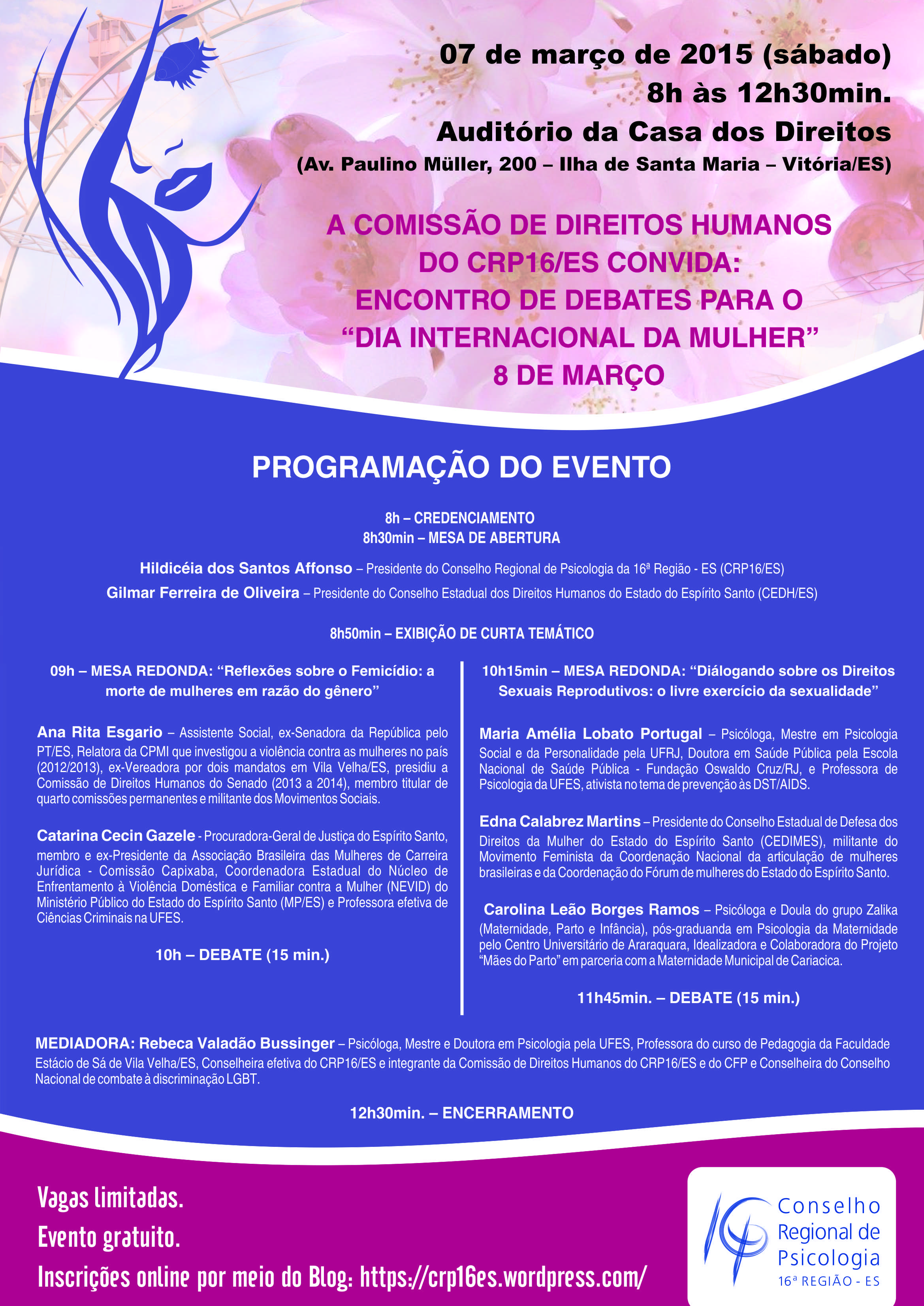 No mês em que é comemorado o “Dia Internacional da Mulher”, o Conselho Regional de Psicologia da 16ª Região – ES, por meio de sua Comissão de Direitos Humanos, convida a categoria profissional para participar do evento “Encontro de Debates para o Dia Internacional da Mulher – 8 de Março”.