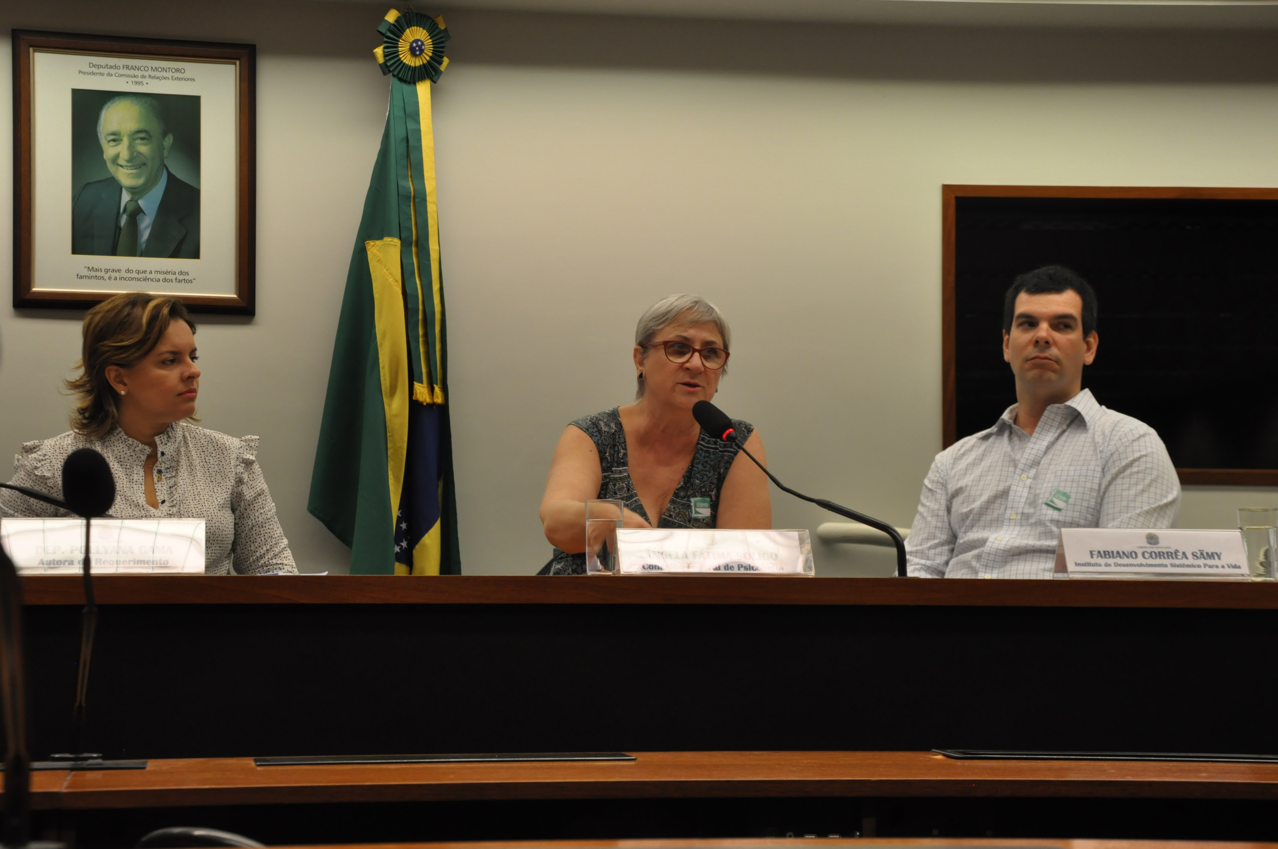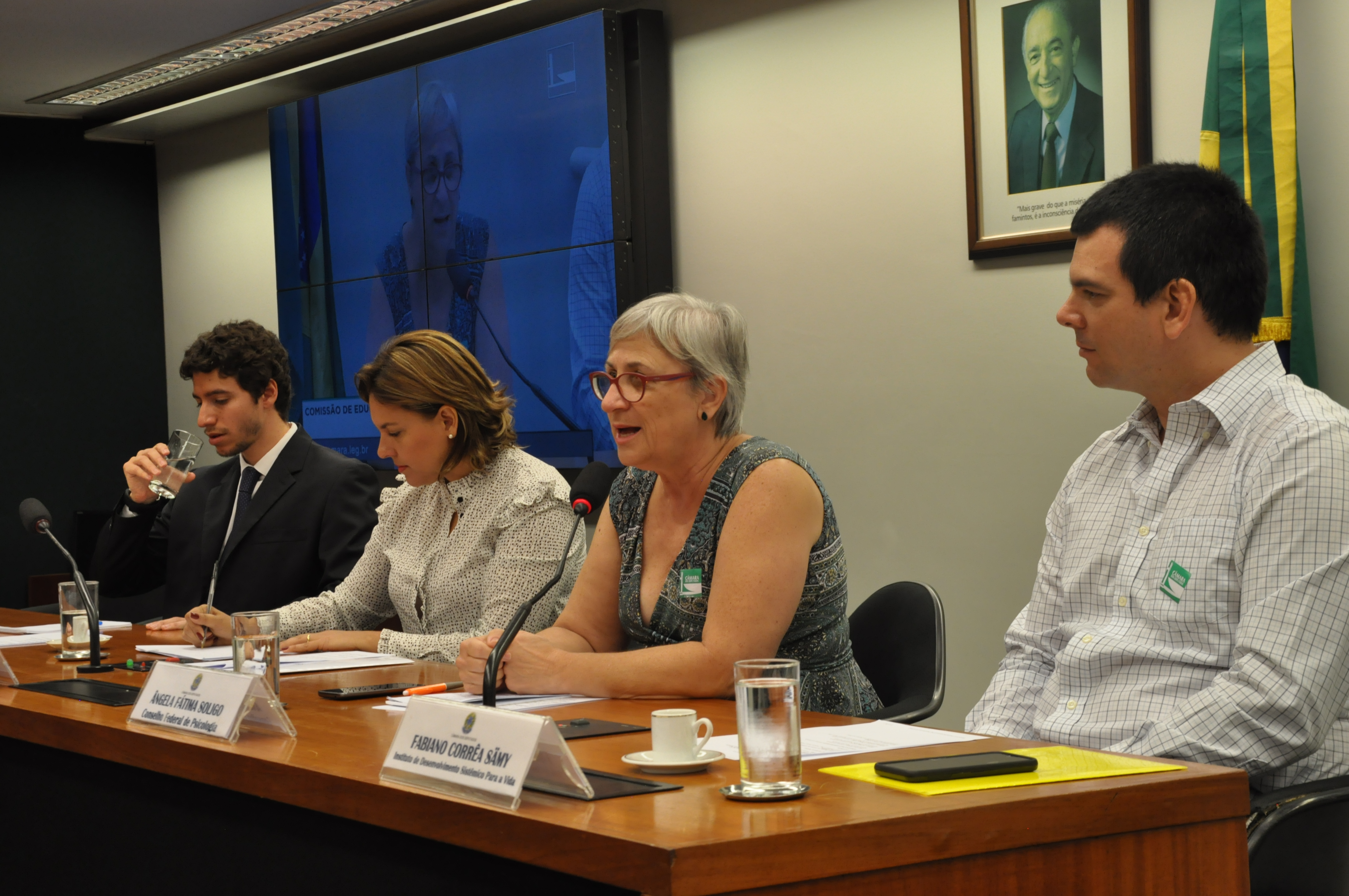 A deputada Pollyana Gama (PPS/SP), o coordenador de projetos da Todos pela Educação, Caio Callegari, e o representante do Instituto de Desenvolvimento Sistêmico para a Vida, Fabiano Pereira Corrêa Samy, participaram do debate.