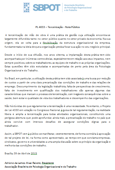 A Associação Brasileira de Psicologia Organizacional (SBPOT) divulgou nesta quinta (09) nota pública sobre o Projeto de Lei 4330/04, que propõe a regulamentação dos contratos de prestação de serviços terceirizados. Leia o texto abaixo.