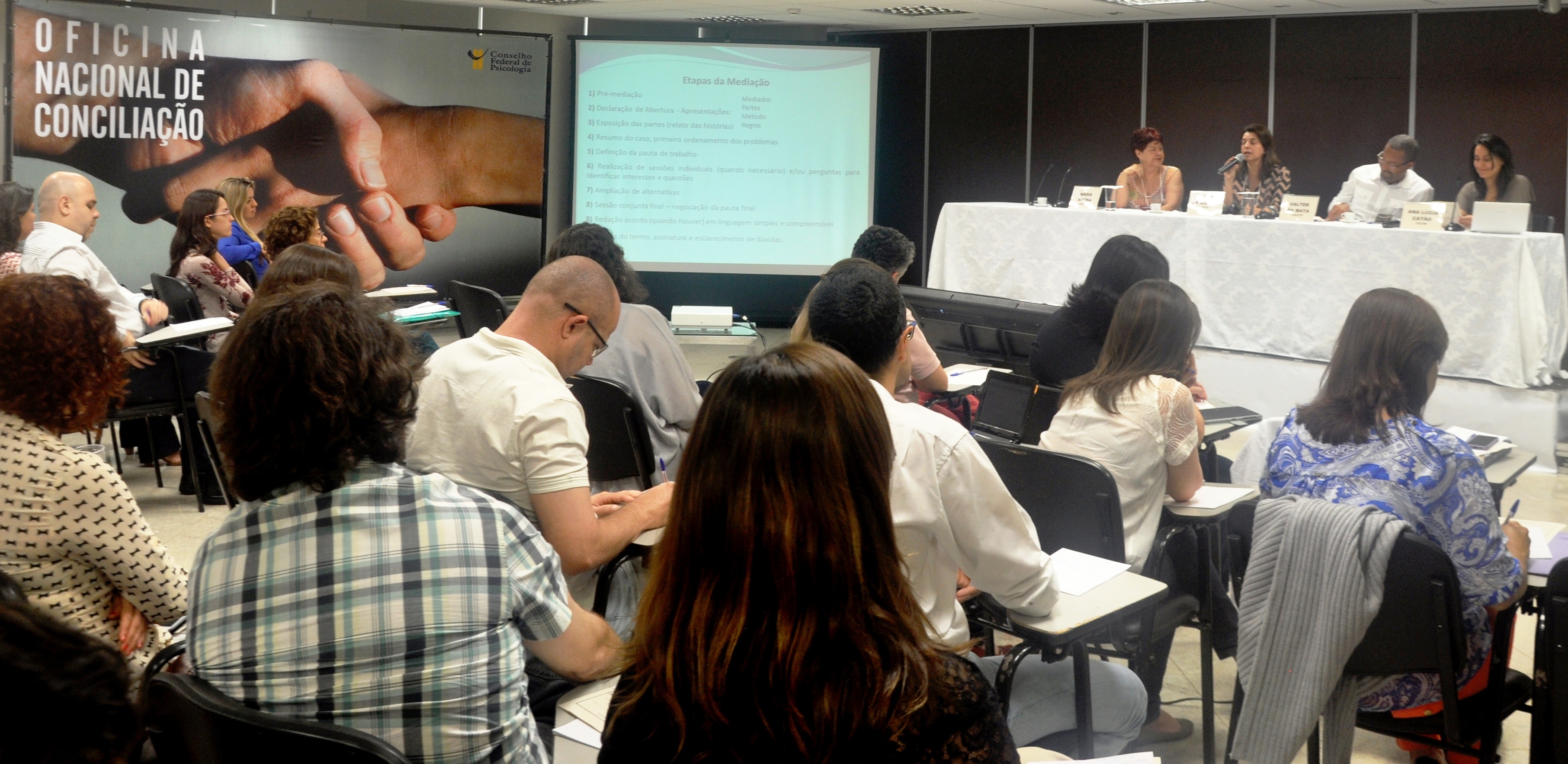 A oficina contou com uma mesa de abertura, com a presença da presidente do CFP,Mariza Borges, dos conselheiros da Secretaria de Orientação e Ética do CFP, João Baptista Fortes de Oliveira e Maria Augusta Speller e também Nádia Rocha. Mariza Borges falou sobre a contribuição da desjudicialização e da conciliação para um novo processo de diálogo, não somente no Sistema Conselhos, mas como “uma mudança de nossa forma de ser e estar no mundo”.