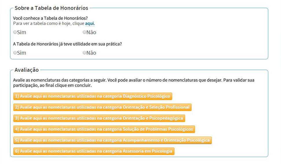 A consulta foi respondida por meio de formulário online, disponibilizado nos sites do CFP e da Fenapsi, e continha questões relativas ao perfil do participante e perguntas sobre a funcionalidade da Tabela de Honorários, além da avaliação de nomenclaturas das categorias elencadas atualmente: Diagnóstico Psicológico, Orientação e Seleção Profissional, Orientação Psicopedagógica, Solução de Problemas Psicológicos, Acompanhamento e Orientação Psicológica e Assessoria em Psicologia.
