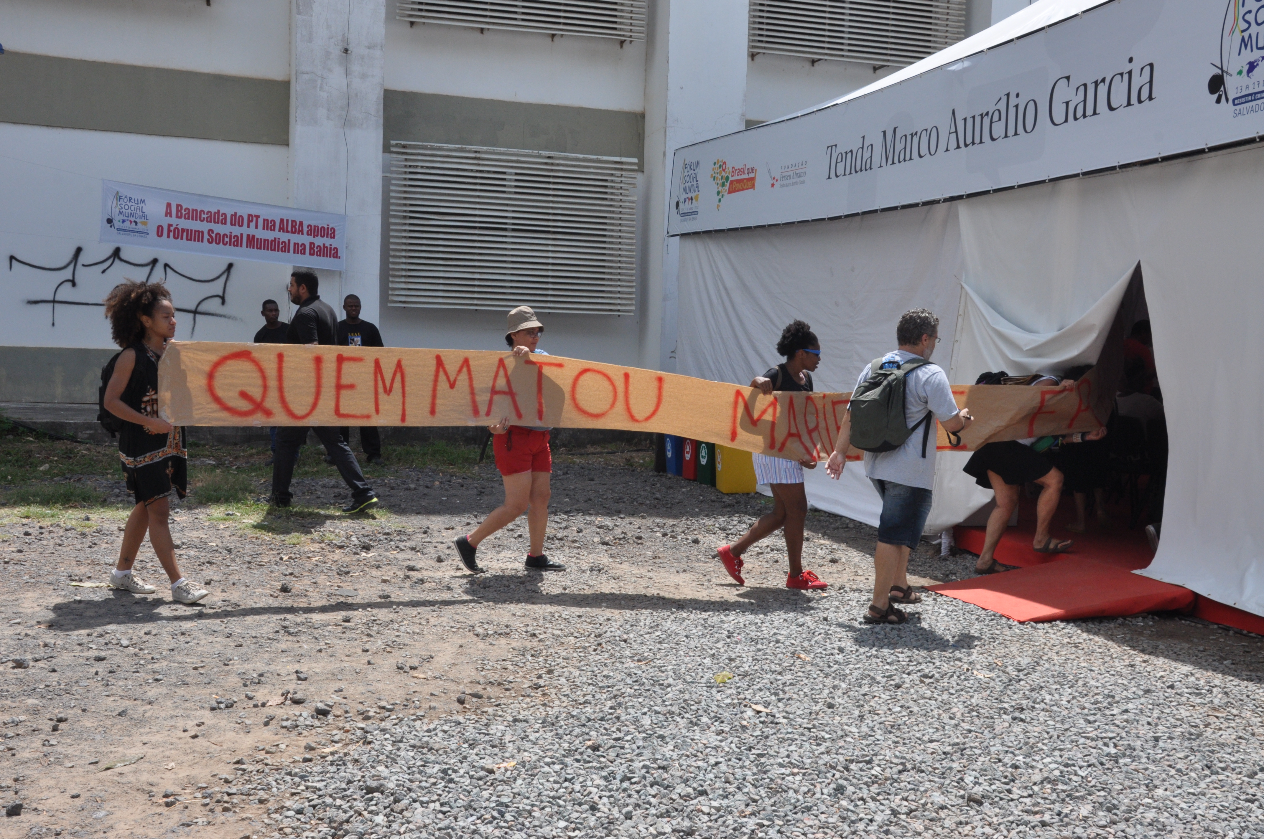 Marielle, presente! A execução da vereadora Marielle Franco e do motorista Anderson Gomes foi o foco principal de diversas mesas de debate na manhã desta quinta-feira (15), no Fórum Social Mundial (FSM 2018). O Conselho Federal de Psicologia (CFP) também pautou a discussão em suas atividades nas Tendas Marcus Vinícius e Direitos Humanos. Marielle foi assassinada a tiros na Região Central do Rio na noite de quarta-feira (14). Entre cartazes e vozes clamando por justiça, grande parte dos participantes do FSM aderiram ao ato que homenageou Marielle Franco, durante à tarde.