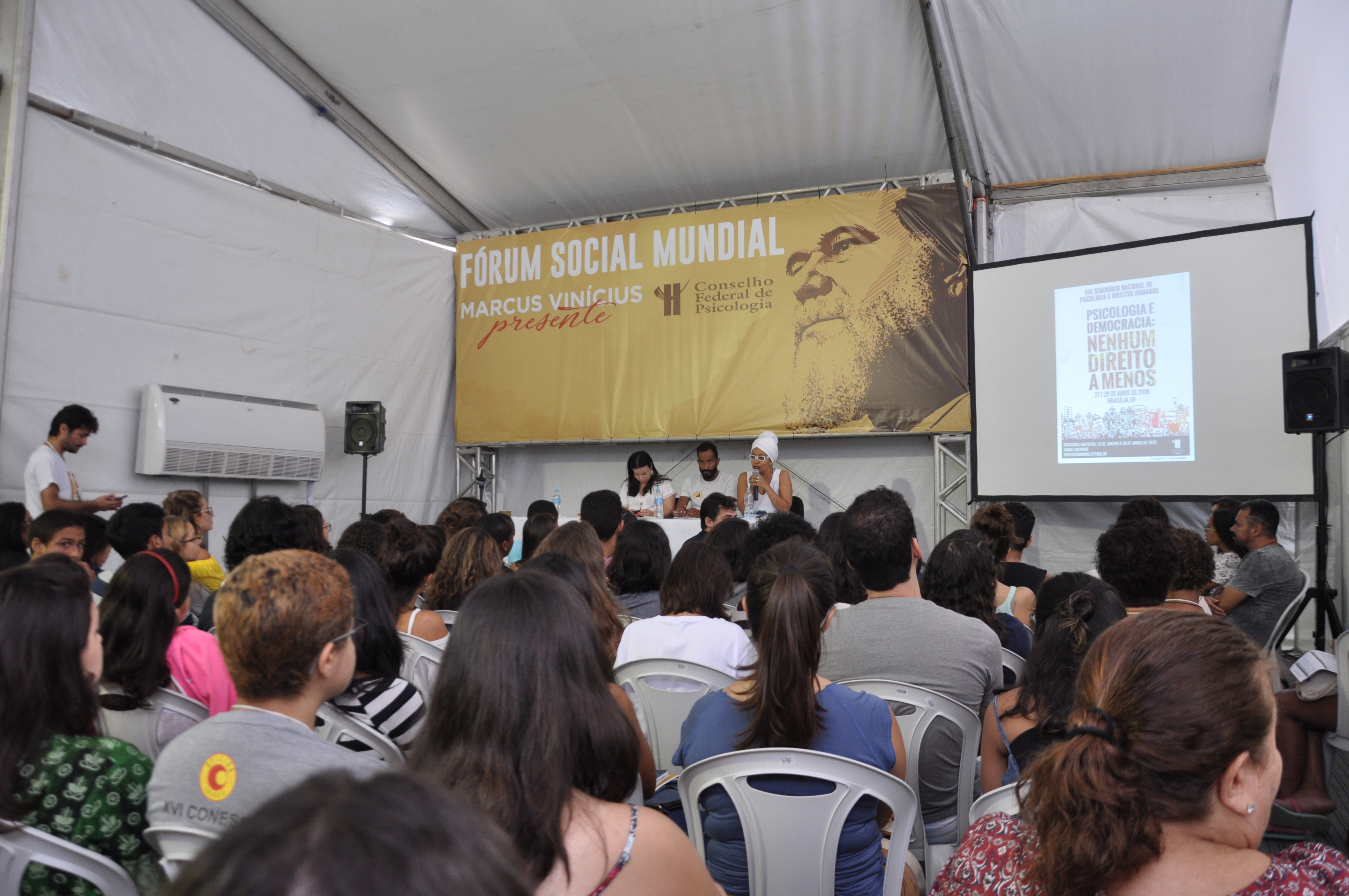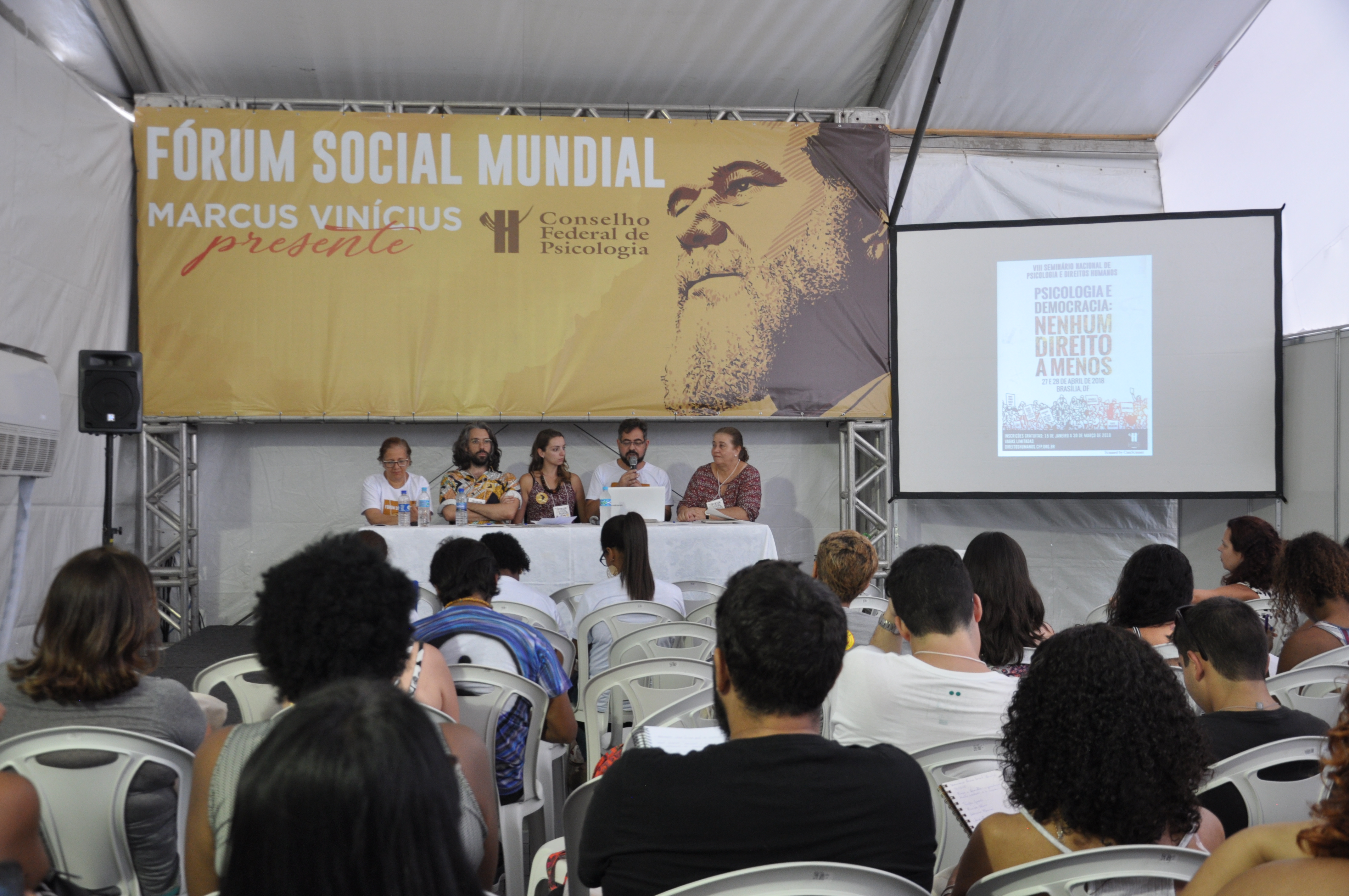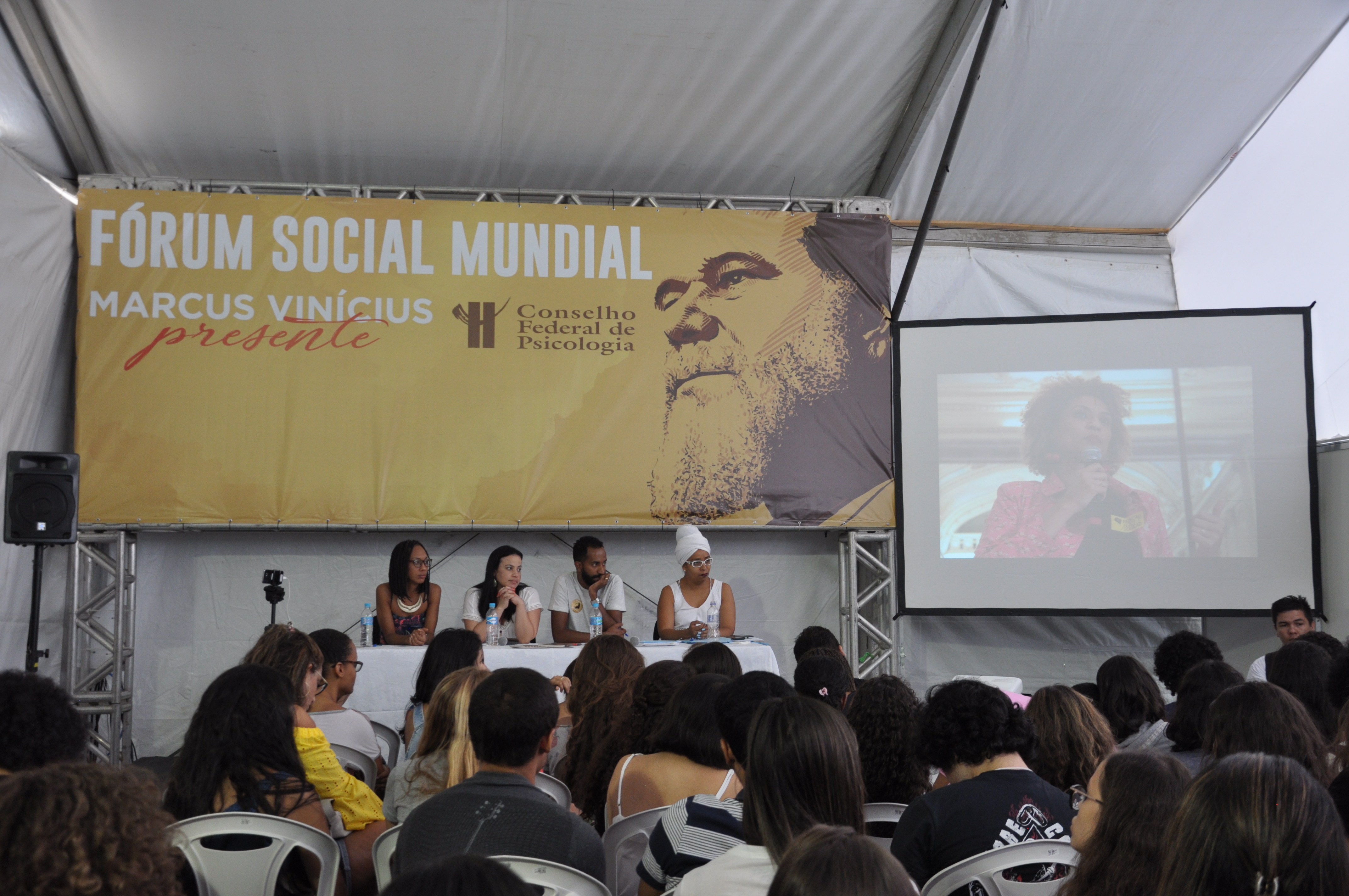 Marielle, presente! A execução da vereadora Marielle Franco e do motorista Anderson Gomes foi o foco principal de diversas mesas de debate na manhã desta quinta-feira (15), no Fórum Social Mundial (FSM 2018). O Conselho Federal de Psicologia (CFP) também pautou a discussão em suas atividades nas Tendas Marcus Vinícius e Direitos Humanos. Marielle foi assassinada a tiros na Região Central do Rio na noite de quarta-feira (14). Entre cartazes e vozes clamando por justiça, grande parte dos participantes do FSM aderiram ao ato que homenageou Marielle Franco, durante à tarde.