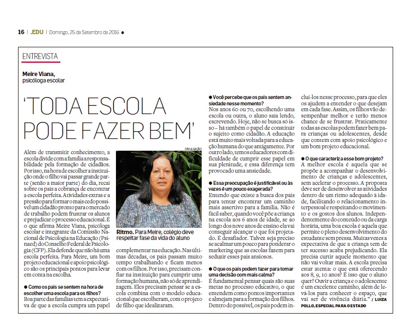 A conselheira do 16º Plenário do Conselho Federal de Psicologia (CFP), Meire Nunes Viana, foi entrevistada para o caderno “Ponto Edu (.edu)” do jornal O Estado de S. Paulo, publicado no último domingo, 25 de setembro. A matéria intitulada “Lição de Casa: decidir a escola” abordou o dilema na hora de escolher uma escola para o (a) filho (a), o que costuma exigir pesquisa e informação sobre localização, preço e, sobretudo, a linha educacional.