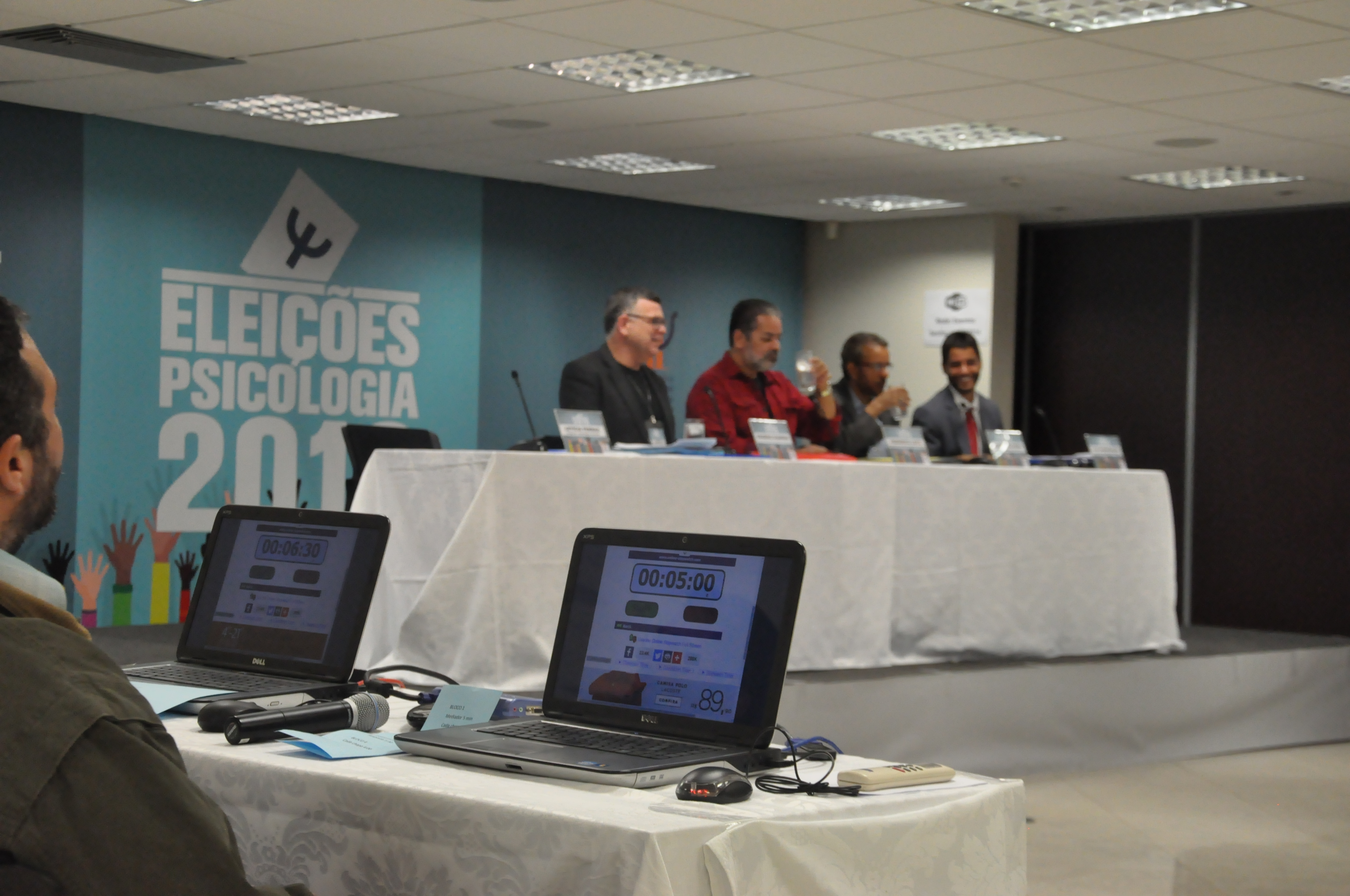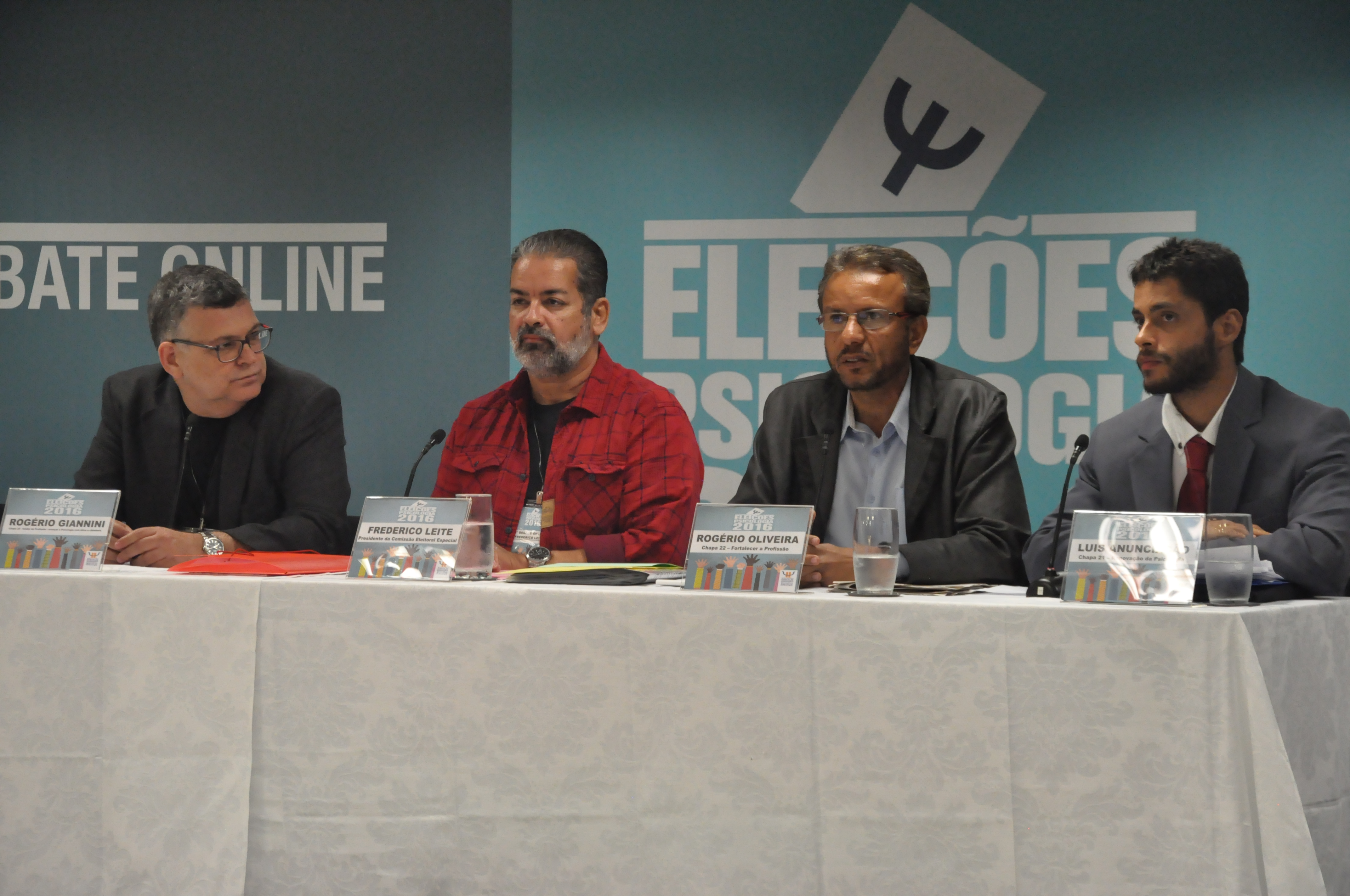 Participaram os representantes da Chapa 21 (“Renovação da Psicologia”), Luis Flavio Chaves Anunciação; da Chapa 22 (“Fortalecer a Profissão”), Rogério Oliveira; e da Chapa 23 (“Cuidar da Profissão: avançar a Psicologia com ética e cidadania”), Rogério Giannini. O mediador foi o presidente da Comissão Eleitoral Especial (CEE), Frederico Leite. A representante da Chapa 24 (“Psicólogos em Ação”), Letícia Colombo Medeiros Ferraz, não pôde comparecer por motivo de saúde.